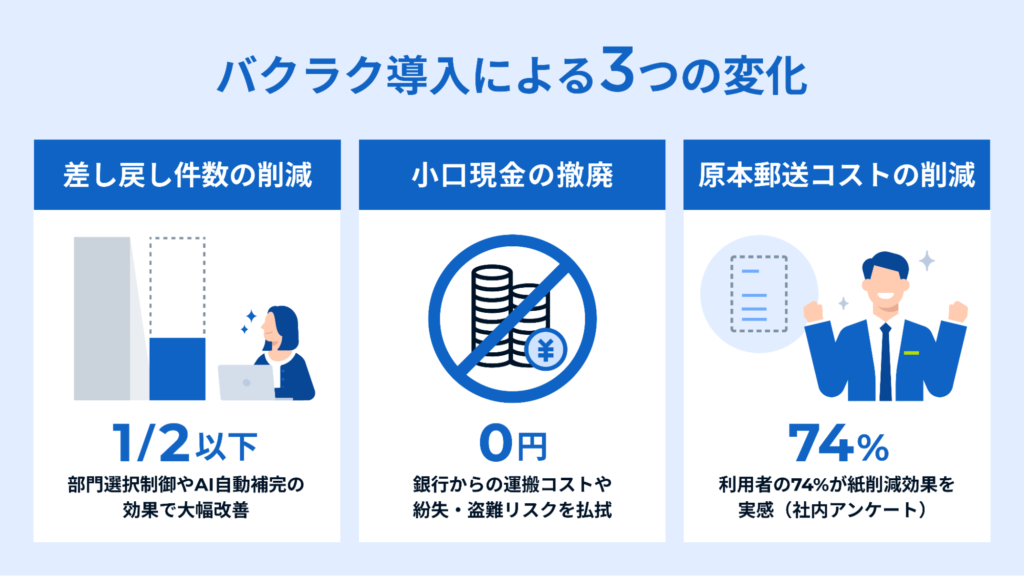 具体的な効果として、まず経理課からの差し戻し件数が従来の半分以下に改善されました。部門選択の制御やAIによる自動補完が効いています。また、小口現金の撤廃により、現金管理リスクと手間をなくせています。