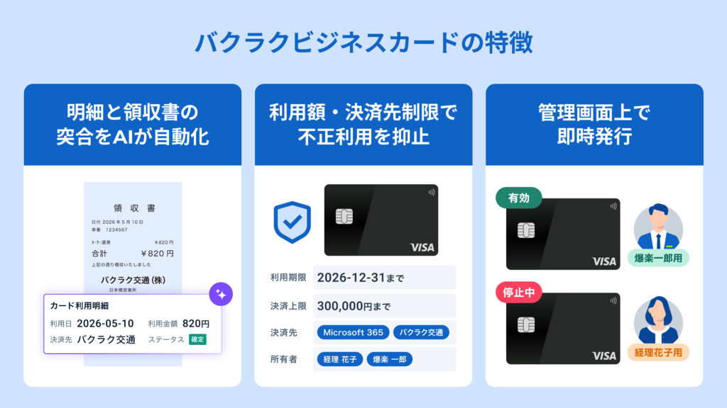 同社がバクラクに関心を持ったきっかけは、「バクラクビジネスカード」でした。バクラクビジネスカードは、利用期間や金額、決済先の制御ができる法人カードです。カード決済後に領収書を添付できる申請機能も搭載しています。
