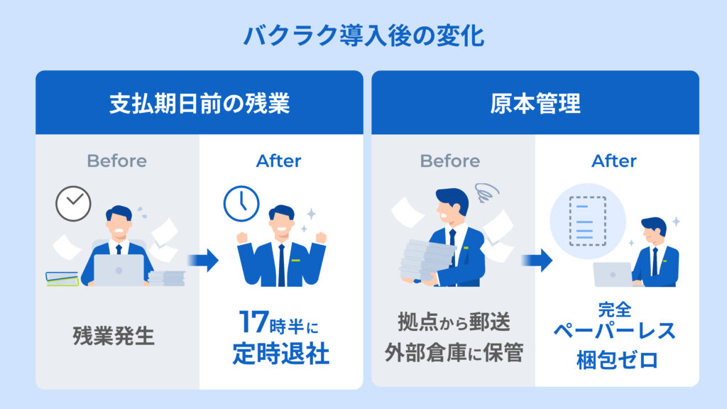 これまでの膨大な紙書類の管理がなくなったことも大きな改善でした。バクラクは電子帳簿保存法に対応し、証憑にタイムスタンプが付与されるため、請求書や領収書原本の紙書類の回収も不要になったのです。
