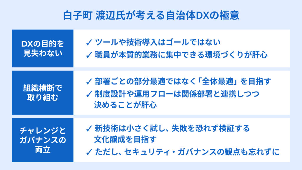 渡辺さん:私が自治体のDXを進めるうえで、特に大事にしていることは、「DXの目的を見失わないこと」「組織全体で取り組むこと」「新しい技術へのチャレンジ精神と適切なガバナンスの両立」の3点です。
