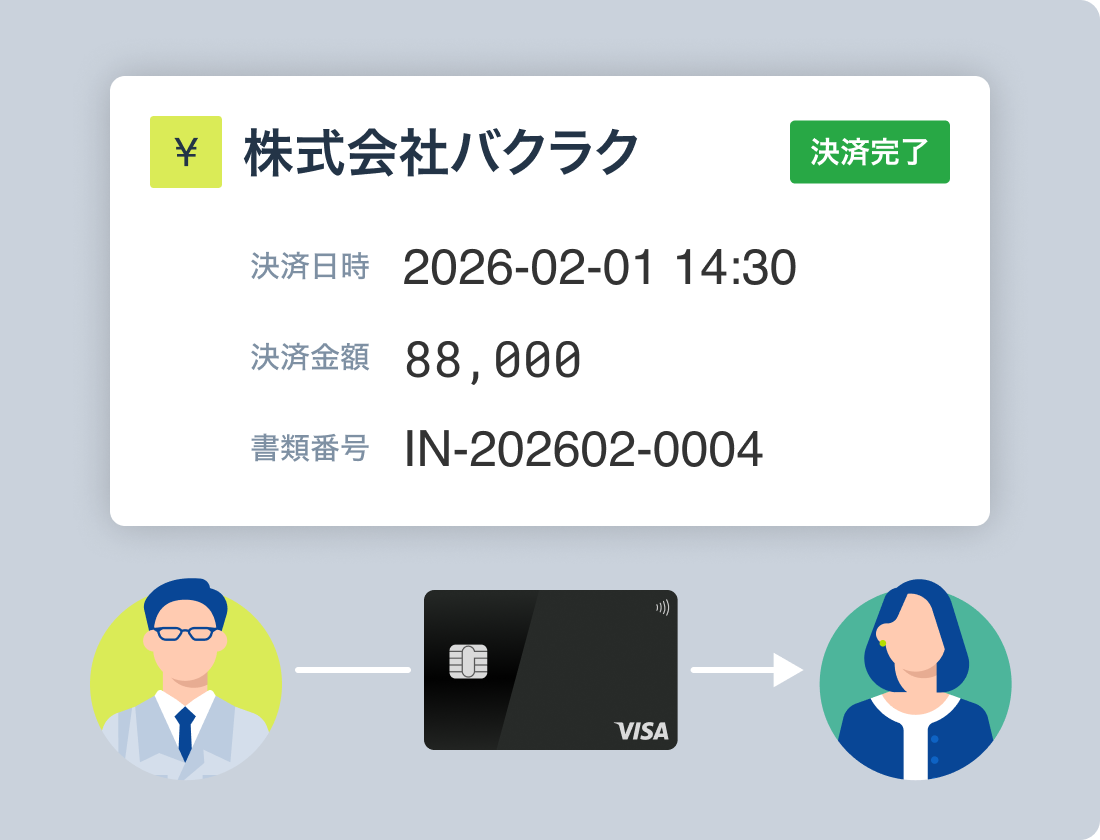 請求書を受け取った取引先は、専用リンクからすぐにカード決済の処理が可能。また、決済情報は請求元の管理画面に即時連携され、リアルタイムに入金情報を管理できます。
