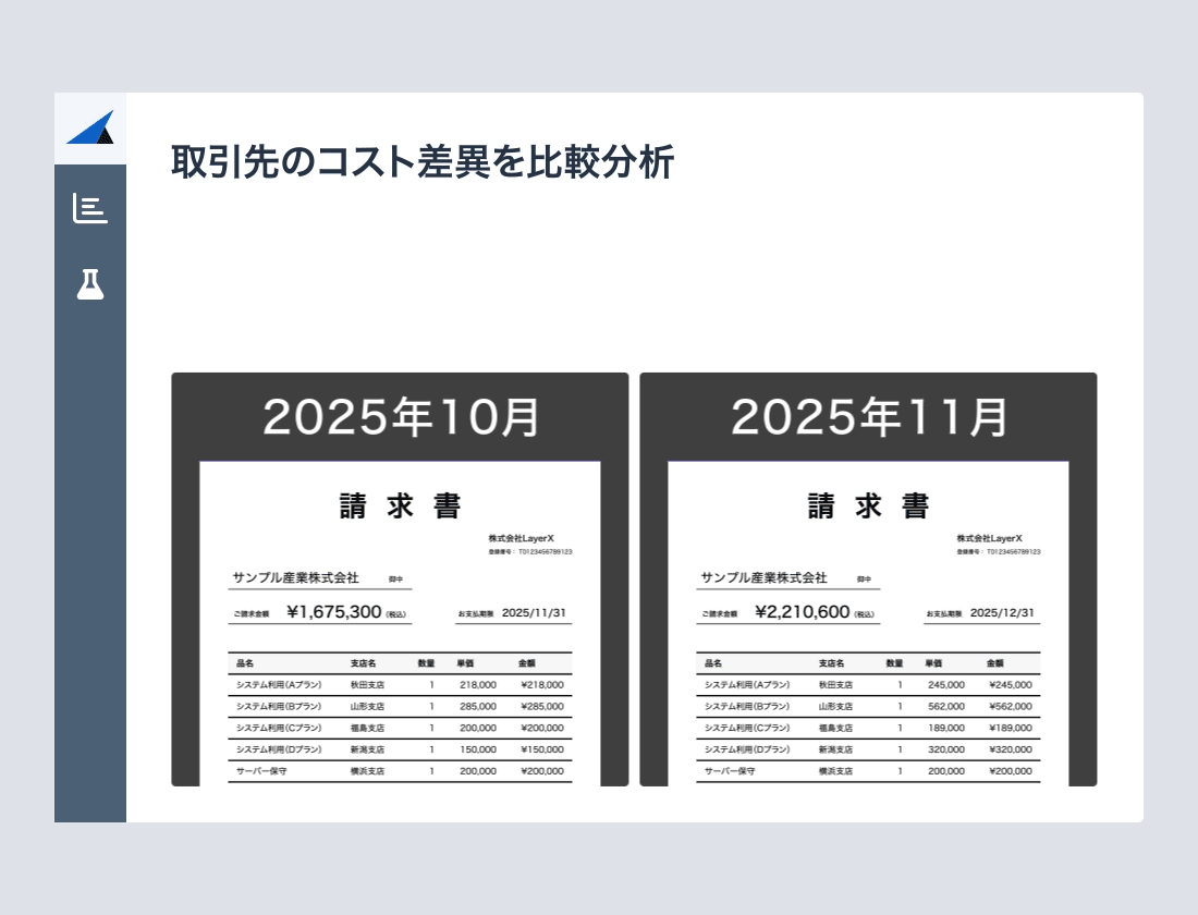 バクラク請求書受取にアップされた証憑をもとにその「差額の理由」をAIが瞬時に比較・分析します。