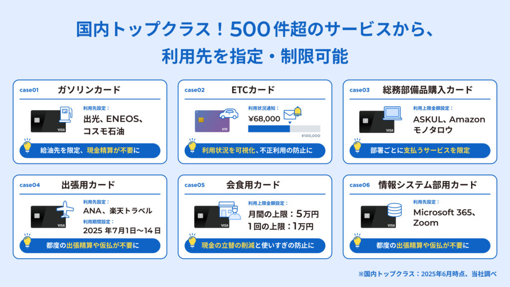 「バクラクビジネスカード」は国内トップクラスの不正利用防止機能※により、500超に及ぶサービスから利用先を指定/制限することで、目的外利用や不正な経費利用を未然に防ぎコーポレート・ガバナンスを大幅に強化します。さらに、カード単位で利用上限金額/利用期間/通貨の制限も可能です。これらの機能を通じて、より安全なカード運用を実現します。 ※2025年6月時点、当社調べ