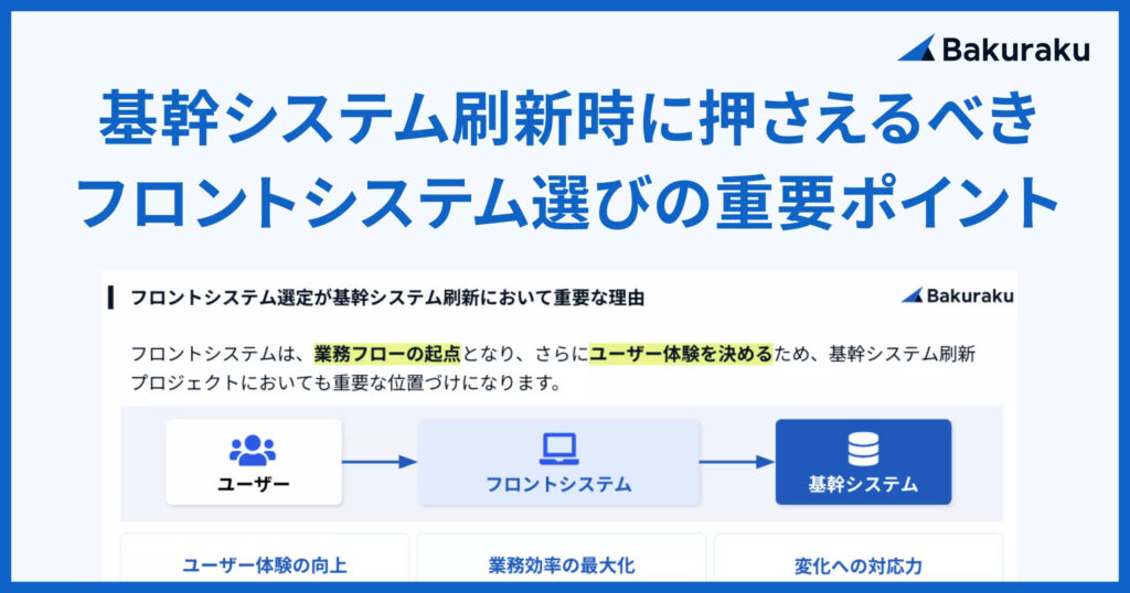 ERPパッケージをはじめとする基幹システムの刷新や再構築を進めている企業のDX推進担当者様必見の資料です。AI時代に対応するシステム構築において重要となるフロントシステム選びのポイントをご紹介しています。