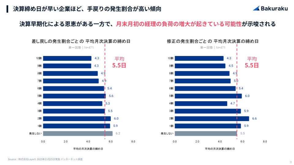 具体的には、差し戻しの発生割合が10割(すべての申請で発生)の企業では平均決算締め日が5.5日であるのに対し、発生なしの企業では6.2日となっています。この結果から、決算早期化の恩恵がある一方で、修正による月末月初の経理の負荷の増大が起きている可能性が示唆されます。