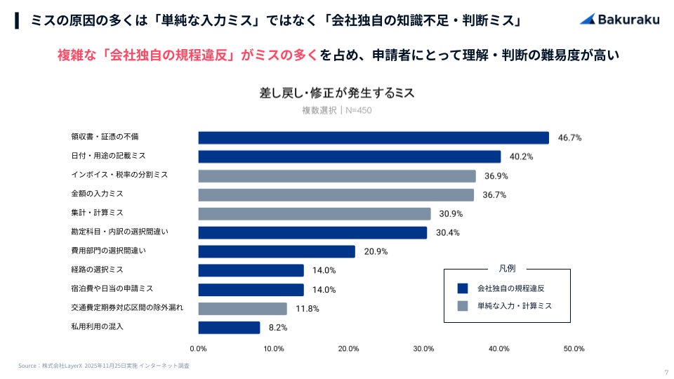 特に発生割合が高い原因の上位には「領収書・証憑の不備(46.7%)」や「日付・用途の記載ミス(40.2%)」が挙げられています。