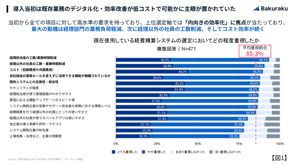 株式会社LayerX(本社:東京都中央区、代表取締役CEO:福島良典、以下「LayerX」)は、経費精算システムの導入・選定に関わった経理・財務担当者471名を対象に、「経費精算システムの選定基準の変遷と月次決算早期化への影響」に関する実態調査を実施しました。