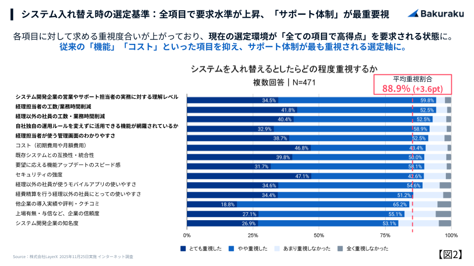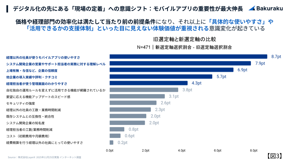 導入当初(旧選定軸)とシステム入れ替え時(新選定軸)を比較すると、最も伸び率が高かったのは「モバイルアプリの使いやすさ(+8.7ポイント)」でした。価格や経理部門の効率化以上に「具体的な使いやすさ」や「活用支援体制」といった、実運用に即した体験価値が重視されることが分かりました。(図3)