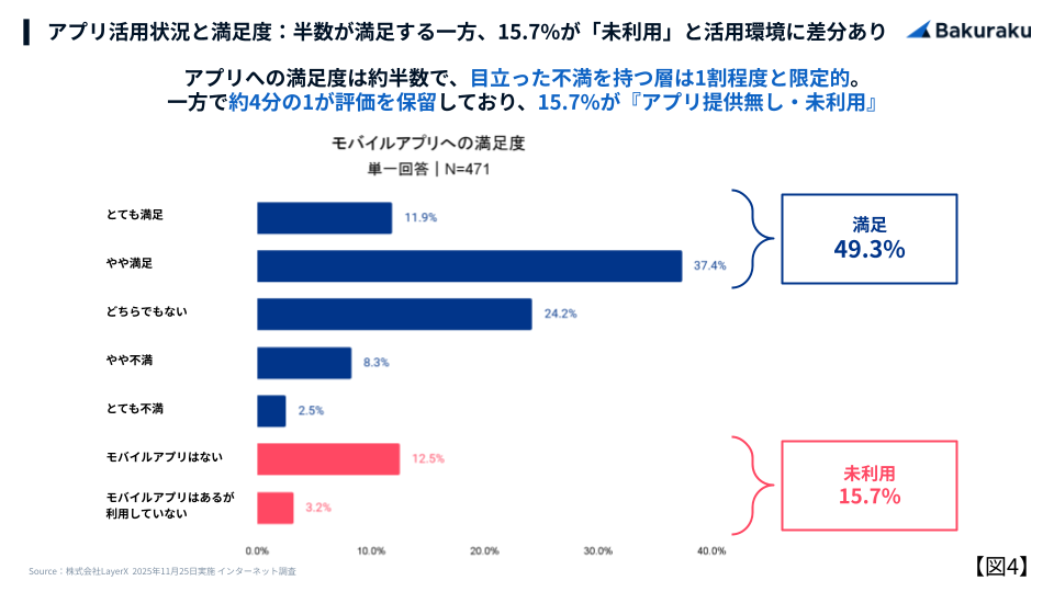 アプリへの満足層は約半数(49.3%)にのぼり、「とても不満」と答えた層は限定的。一方で、15.7%がアプリ未利用・未導入の状態であることが分かった。