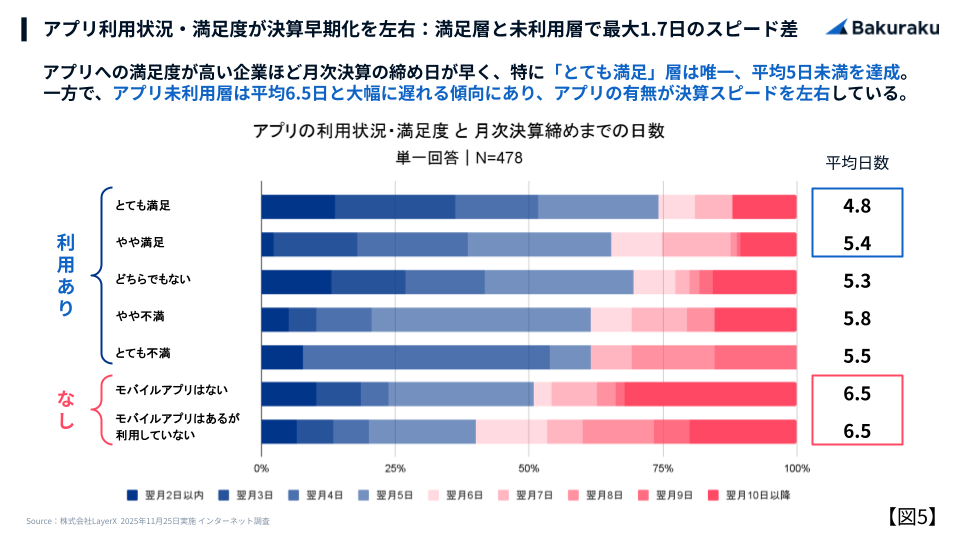 アプリの活用状況を調査したところ、「利用し、かつ満足している」層は全体の49.3%でした。(図4)また、活用状況と月次決算締め日を分析した結果、アプリを「利用し、かつ満足している層」は決算スピードが顕著に早いことが判明しました。特に「とても満足」している層の平均締め日は4.8日であり、全グループで唯一5日を切る結果となっています。一方で、アプリが「ない」または「利用していない」層は平均6.5日と、満足層に比べて遅延している実態が明らかになりました。(図5)