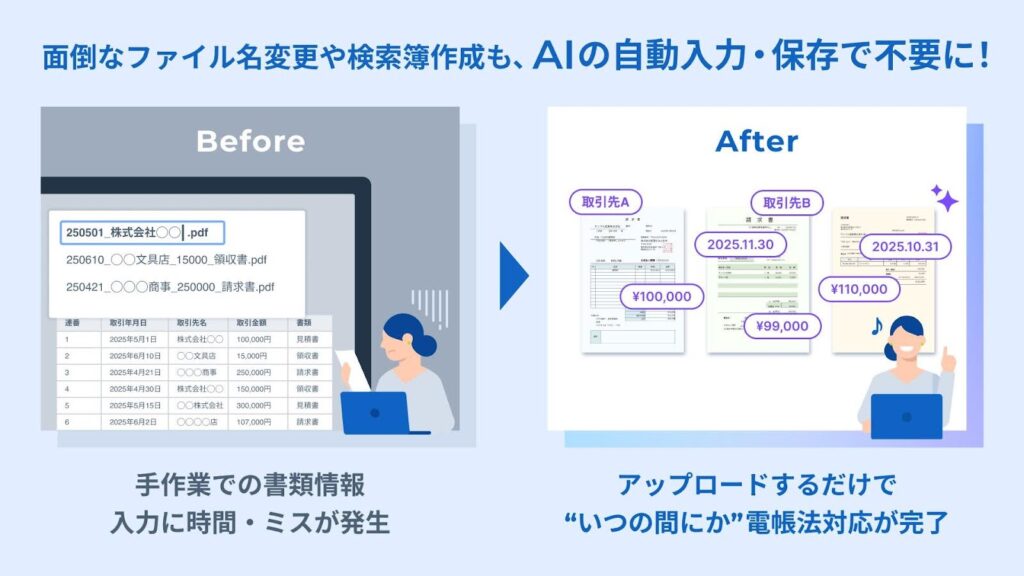 さらに、これまでは国税関係書類の電子化と電子帳簿保存法への対応のために、余計なコストと手動の工数が発生していましたが、「バクラク申請」は電子化された文書にタイムスタンプを自動付与するため、“いつの間にか”電帳法対応が完了する状態を実現し、法令遵守と業務効率化をシームレスに両立できます。