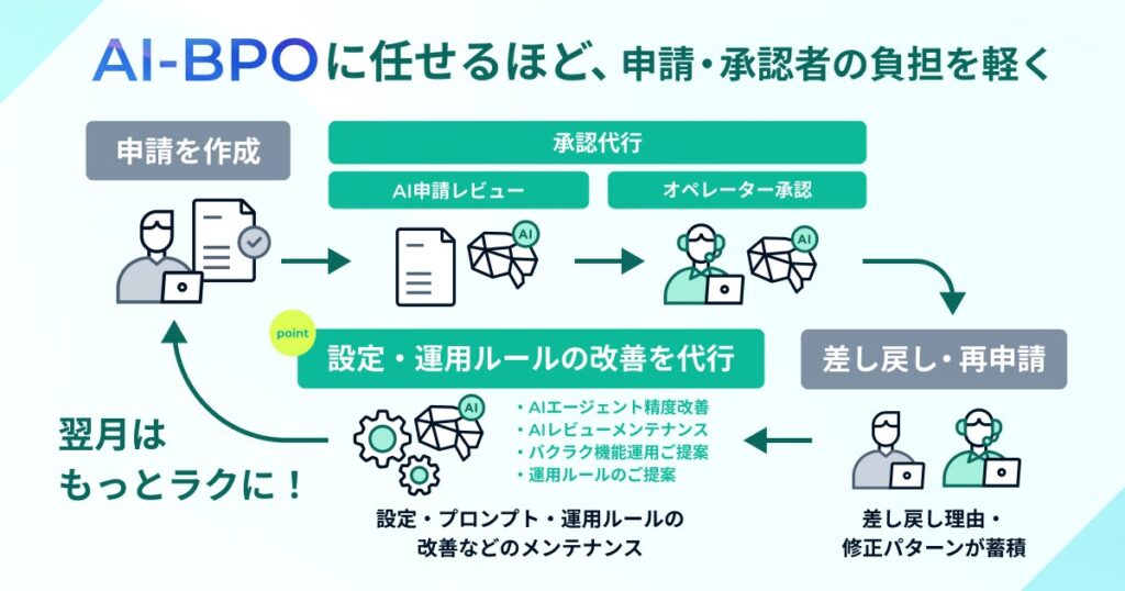 AIエージェントが主体のAI-BPOを行うことで、差し戻しを始めとするオペレーターのフィードバックがAIの精度改善に活用され、代行をすればするほど高速・正確な承認業務を実現して参ります。