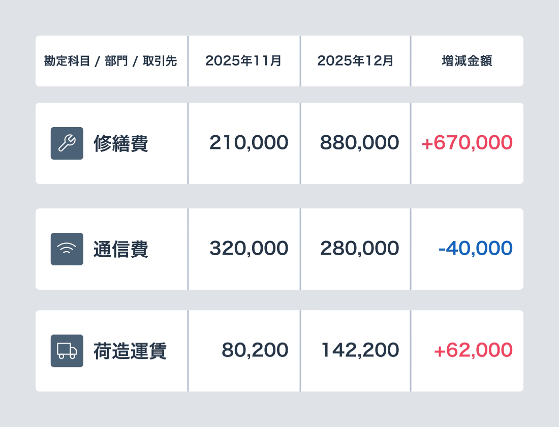 前月や前年同月と比較して、どの勘定科目・部門・取引先でコストが増減したのかを自動で可視化します。またそこから気になる取引があればAIが仕訳を詳細分析してコメントを作成します。また従来の会計ソフトと違い、決算確定前の段階から請求書等が申請されたタイミングから分析が可能となります。