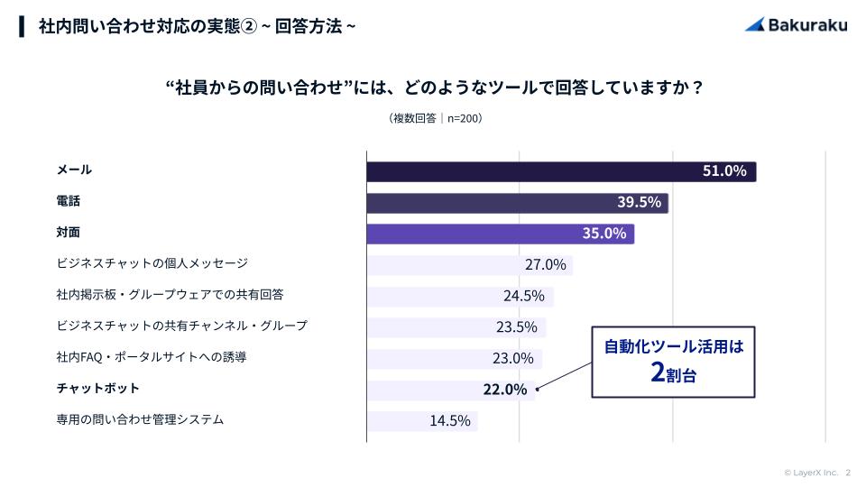“社内問い合わせ”に対応するツールを質問したところ、1位は「メール」(51.0%)、次いで「電話」(39.5%)、「対面」(35.0%)でした。また、「チャットボット」による自動化ツールを活用していると回答したのは22.0%となりました。