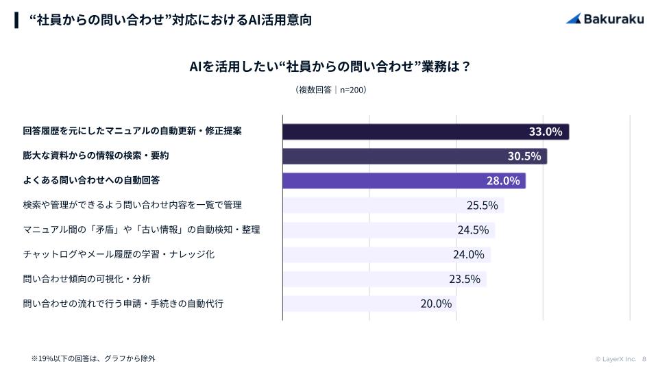 社内問い合わせにおいて、AIに任せたい業務TOP3は、1位「過去の回答履歴に基づくマニュアルの自動更新(33.0%)」、2位「膨大な資料からの情報検索・要約(30.5%)」、3位「よくある問い合わせへの自動回答(28.0%)」
