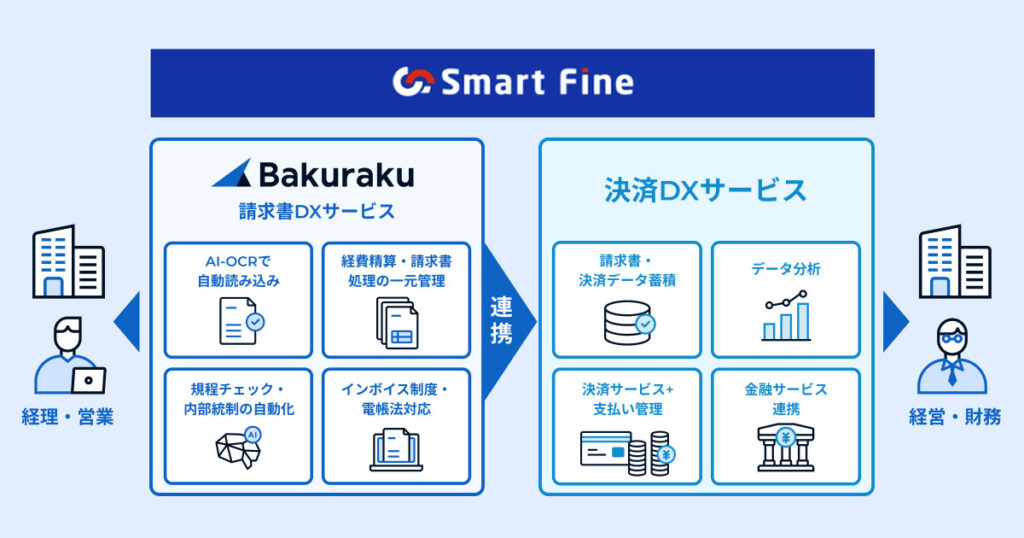 広島銀行が2025年6月から提供開始した、「請求書DX」と「決済DX」を組み合せた独自サービス「〈ひろぎん〉Smart Fine(以下「Smart Fine」)」と、LayerXが提供する「バクラク請求書受取」を連携させることで、請求書の受領から支払処理までを一気通貫でデジタル化します。