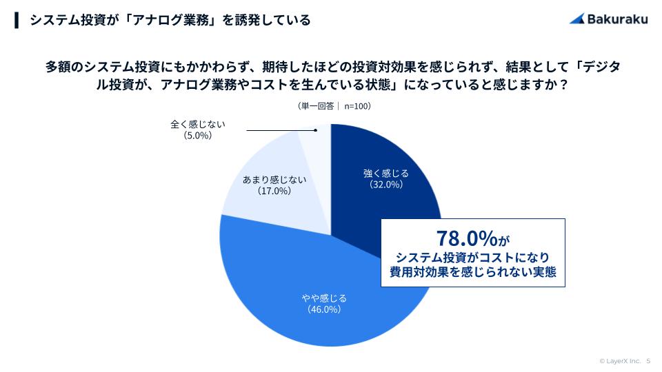 多額のシステム投資を行っているにもかかわらず、期待したほどの費用対効果を感じられず、結果として「デジタル投資が、アナログ業務やコストを生んでいる」と感じるかを質問したところ、32.0%が「強く感じる」46.0%が「やや感じる」となり、合わせて78.0%が、「デジタル投資が、アナログ業務やコストを生んでいると感じる」と回答しました。