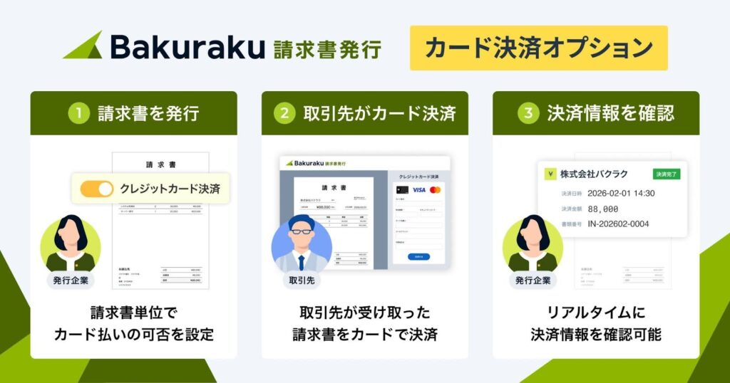 株式会社LayerX(本社:東京都中央区、代表取締役CEO:福島良典、以下 「LayerX」)は、「バクラク請求書発行」において、「カード決済オプション」機能を、本日リリースします。