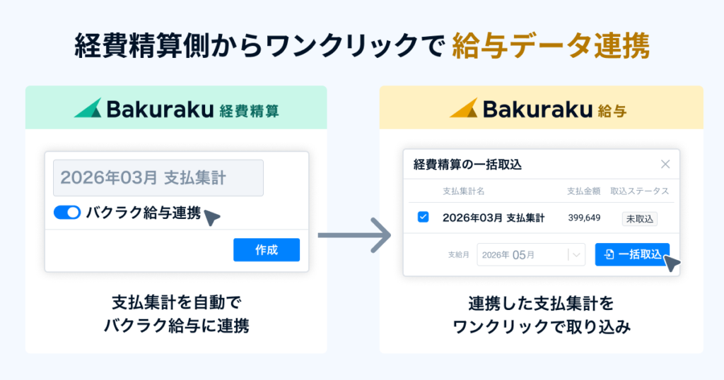 経理担当者がバクラク経費精算で経費申請のチェック・費用計上を終えた後、支払集計を作成する際に「バクラク給与連携」をオンにするだけで、支払データがバクラク給与に自動送信されます。従来のCSV出力・メール送付といった手作業が不要になります。