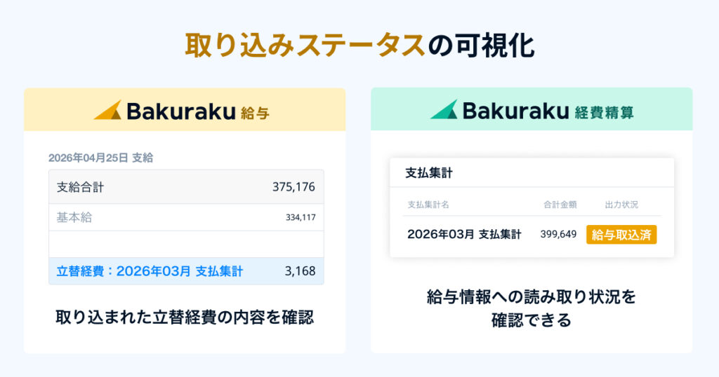 給与計算画面では、取り込まれた立替経費の内訳を確認できます。また、バクラク経費精算(債務管理)側では、支払集計に「給与取込済」のラベルが表示されるため、経理担当者も給与への取り込み状況をリアルタイムで把握できます。経理・労務の双方がデータの連携状況を確認できることで、確認漏れを防止します。
