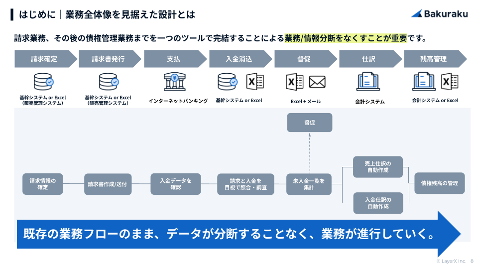 分断を解消するために、「人が主体」の業務から、AIを活用することで「システムが主体」の自律的な業務へと段階的にレベルアップさせる方法を解説します。また、業務全体を見据えた設計に不可欠な3つのポイントである①請求ステータスの可視化、②データの自動連携、③入金消込・仕訳作成の自動化について詳しくお伝えします。