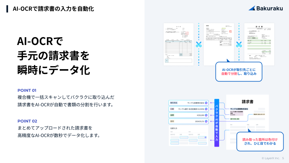 日々進化するAI技術。多くの企業が“高精度“を謳う中、バクラクはその中でもAI-OCRの精度をはじめとするAI活用機能に強みを持っています。では、どのようにしてその強みを実現しているのか、他社サービスと比較してどのような違いがあるのか。バックオフィスから全社の生産性を向上させるために最適なサービスを提供している背景について解説しています。