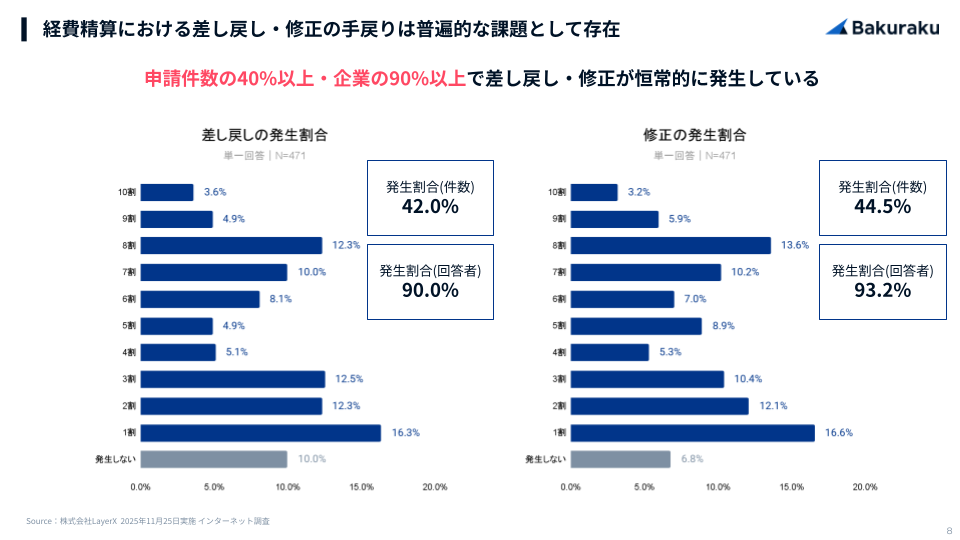 インボイス制度や電子帳簿保存法などの法対応に加え、企業独自の複雑な精算規程により、経費申請の処理難易度は年々高まっています。変化の激しい経営環境において、迅速な経営判断を支える「決算早期化」は多くの企業の最優先課題です。多くの企業がマニュアル整備や周知を徹底していますが、依然として経理現場では差し戻し・修正などの手戻りが絶えず、決算早期化を阻害する大きな要因となっています。