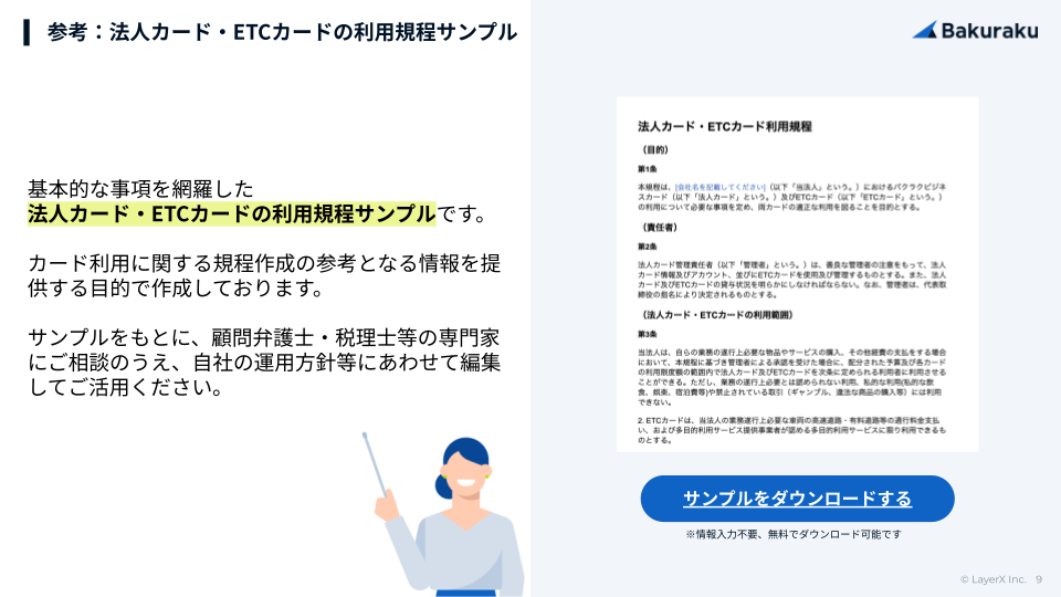 従業員に法人カードを配付時にセットで渡すETCカード・法人カード利用規程サンプルのWordファイルをダウンロードいただけます。自社の運用フローにあわせて適宜編集のうえ、ご活用ください。また、本資料では、ETCカードや法人カードを正しく運用するための3つのポイントをご紹介しています。