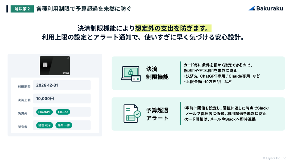 AIサービスの活用が広がる一方で、企業では費用の見えにくさや個人立替、証憑回収、契約管理の煩雑さといった課題が増えています。本資料では、AI活用のスピードを落とさずに費用管理と統制を両立する考え方と、法人カードを活用してAIサービス費用を一元管理する方法を解説します。あわせて、支出の可視化や立替・属人化の解消につながる実務ポイントもご紹介します。