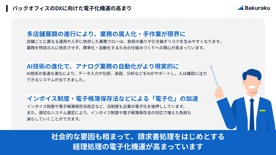 本資料では、ドラッグストア・薬局事業者における多店舗経営で顕在化する経理・バックオフィスの非効率を整理し、その解決策としてのDX推進のポイントを解説しています。