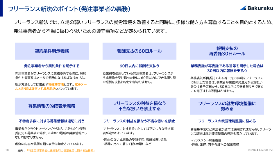 本資料では、11月に施行されたフリーランス新法について、概要や対応が求められる点についてまとめています。