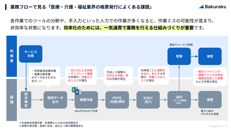 医療・介護業界では、利用者負担請求書や実費分請求書など、複数の書類発行・送付に多くの手間がかかっています。こうした非効率な業務は、作業ミスや法令対応漏れといったリスクにもつながるため、ミスなくスムーズに作業できる仕組みづくりが重要です。