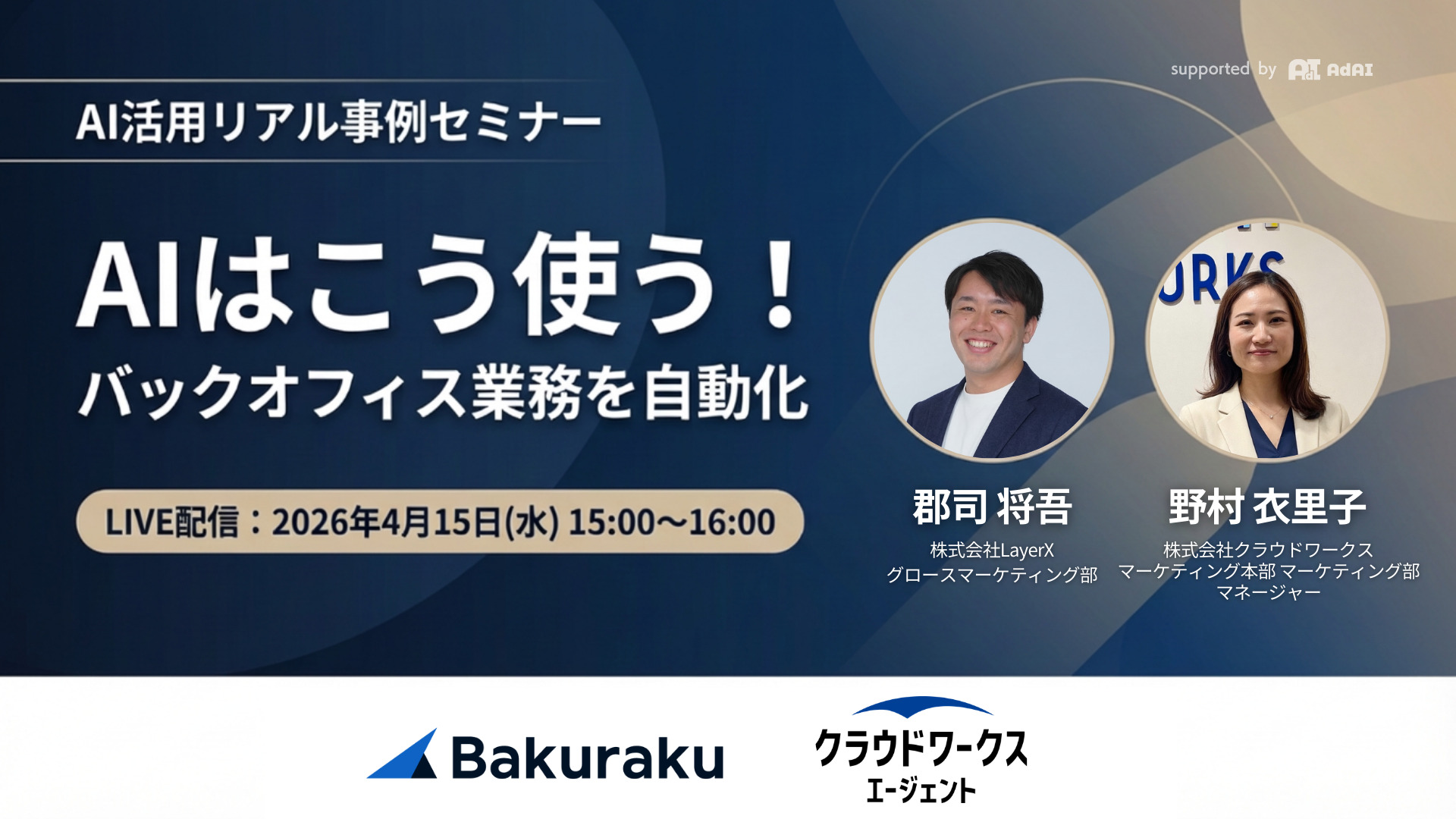 本セミナーでは、バックオフィス業務へのAI実装を実際に推進している当社LayerXとクラウドワークス社から、具体的な活用事例をリアルにご紹介します。