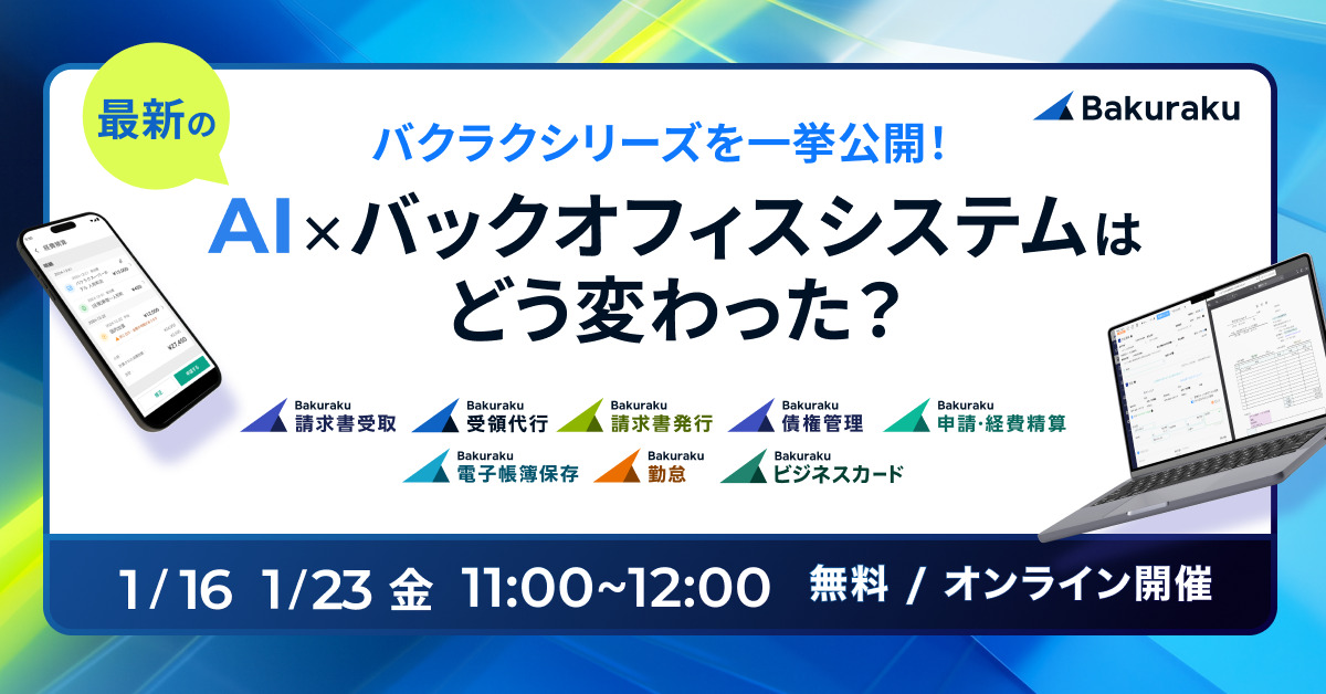 本ウェビナーでは、バクラクシリーズの各プロダクト最新情報を一挙に公開。請求書受取や債権管理、経費精算、法人カード決済、勤怠管理まで含めた幅広いナインナップをご紹介させていただきます。また業務プロセスを踏まえた活用方法もまとめてご紹介します。