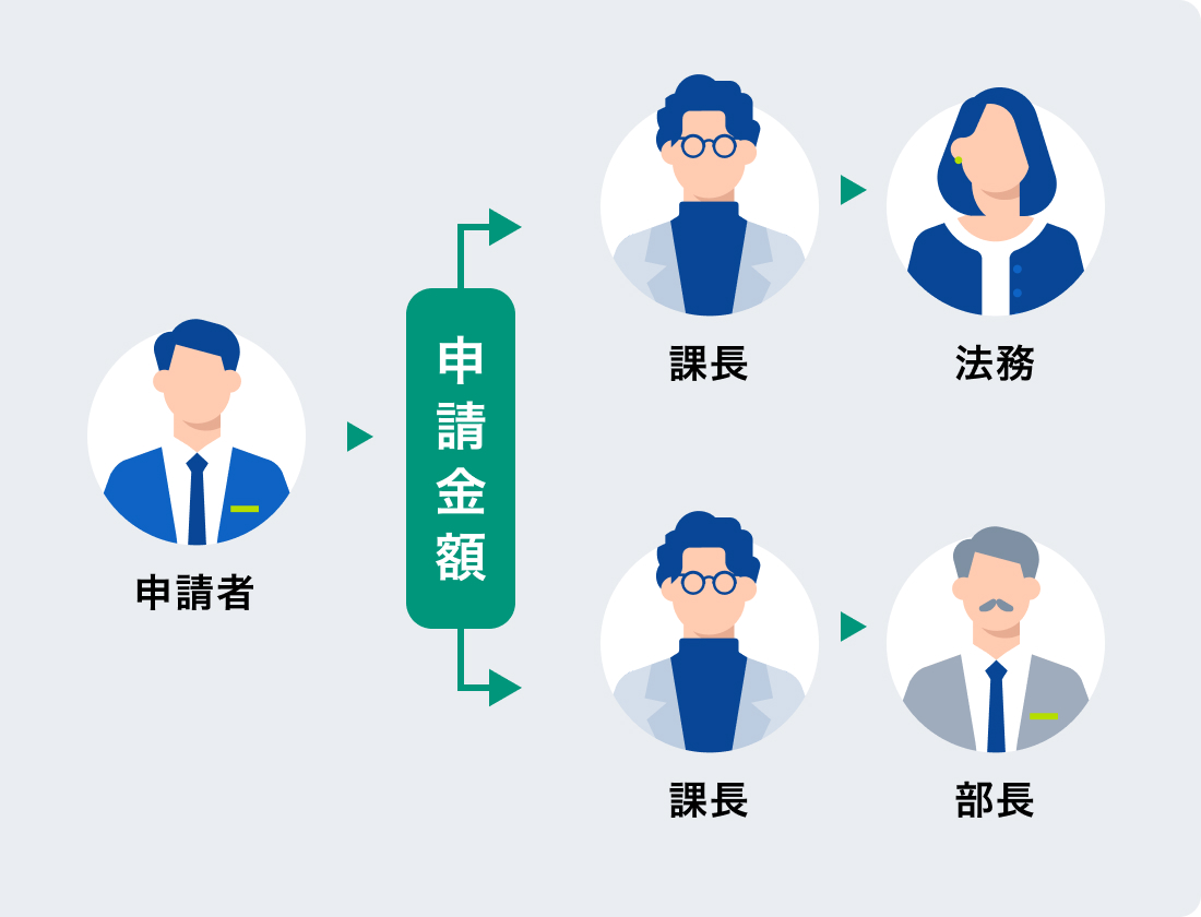 申請金額・役職・チームに応じて承認経路を自動で振り分け。担当者が都度判断する手間をなくし、承認漏れや差し戻しを防ぎます。