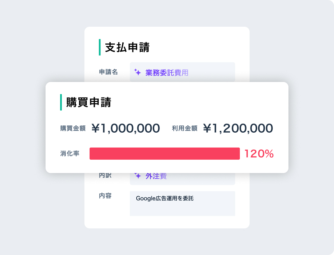 購買申請と支払申請を紐づけることで、承認前に予算消化率を可視化。コスト意識を高めて内部統制を強化します。